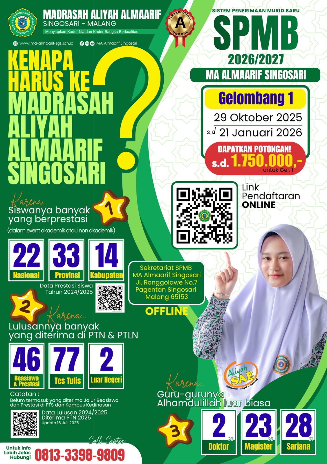 Seleksi Penerimaan Murid Baru (SPMB) MA ALMAARIF SINGOSARI TA.2026/2027 Gel.1 SUDAH DIBUKA
