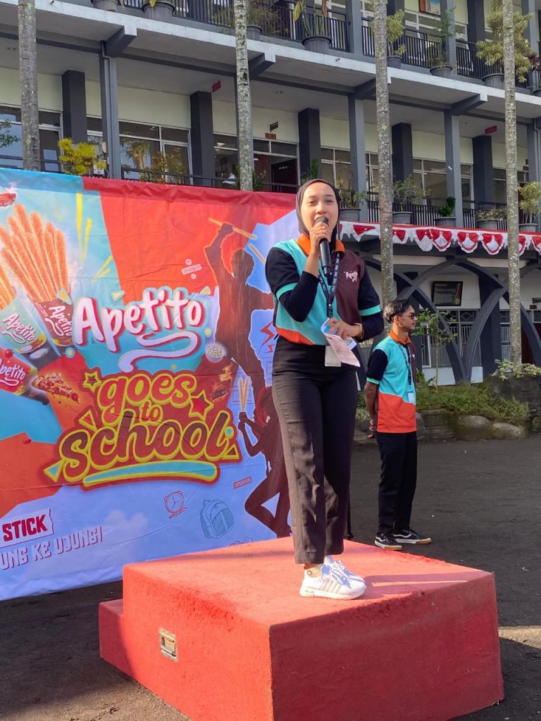 Usai upacara, suasana berubah meriah dengan kehadiran tim Mayora. Mereka memperkenalkan dua produk baru, Apetito dan Fruta Gummy, sambil membagikan snack kepada seluruh peserta. Kegembiraan semakin terasa saat siswa diajak mengikuti lomba seru: makan Apetito dengan “gigi kelinci”, estafet snack, lomba konten terbaik, dan yel-yel Apetito. Sepuluh siswa tampil penuh semangat menyanyikan yel-yel, disambut sorakan riuh. Para peserta dan pemenang menerima hadiah berupa snack tambahan sebagai bentuk apresiasi.